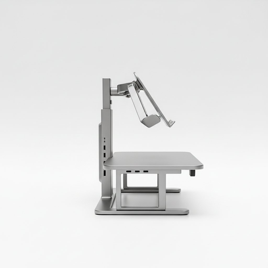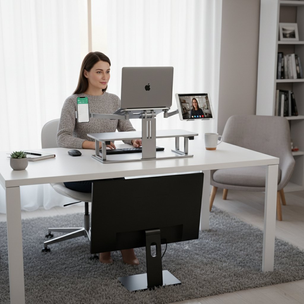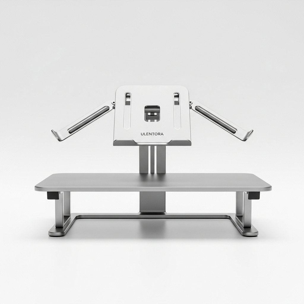 Elevate your workspace and your well-being with the Ulentora Ergonomic Aluminum Laptop Stand. Designed for the modern professional, this sleek and sturdy stand raises your screen to the perfect eye level, promoting better posture and reducing discomfort during long work sessions. Its minimalist design complements any desk setup, making it an essential tool for productivity and health.
